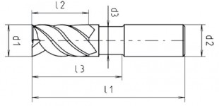High performance carbide end mill especially suitable for machining hardened and high tensile steels.